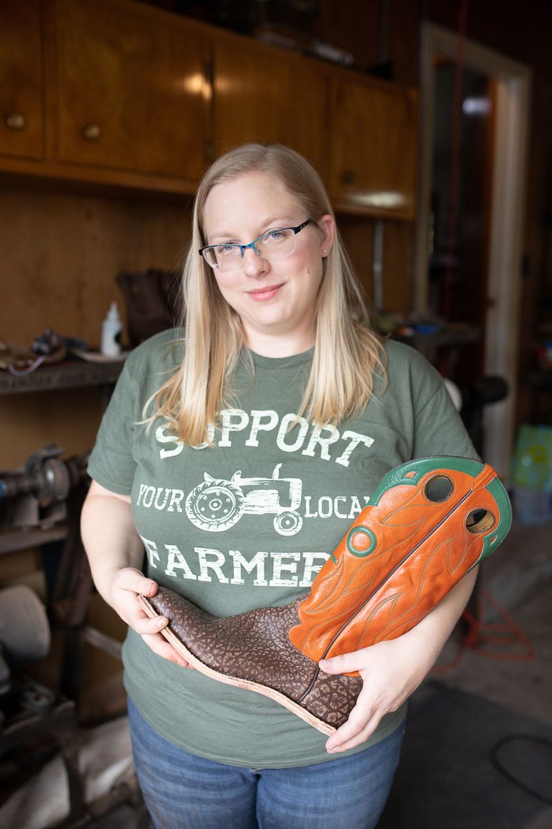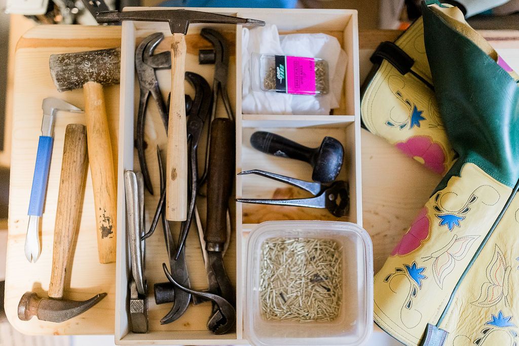 We will start by cutting out the leather and any custom inlays you would like based off of your shoe pattern. Everything is done by hand at our shop in Cheyenne, Wyoming.